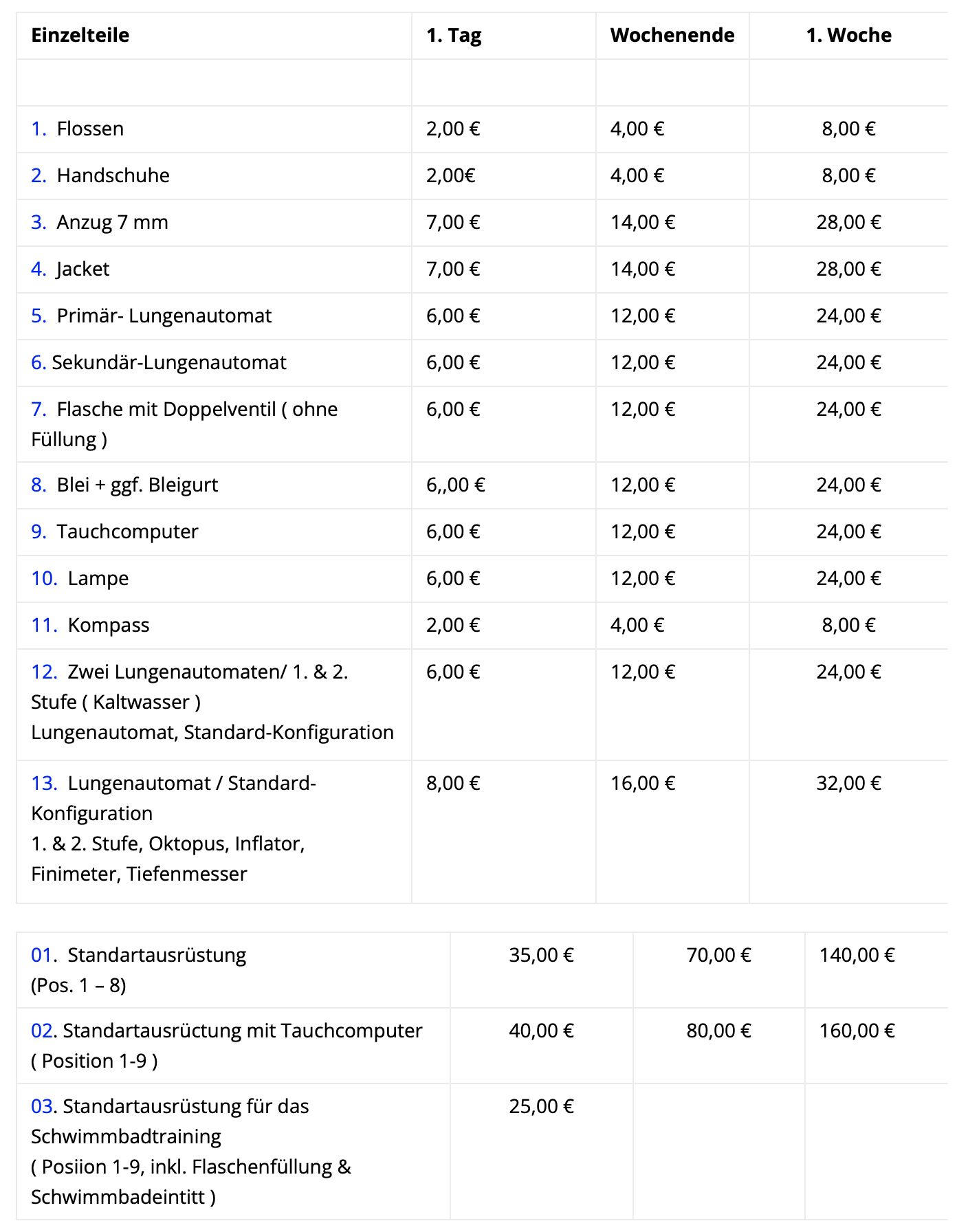 Dann kannst Du Dir bei uns fehlende Ausrüstungsgegenstände oder auch eine komplette Tauchausrüstung leihen! Alle Ausrüstungsgegenstände können wahlweise für einen Tag, ein Wochenende (von Freitag, 16 Uhr bis Dienstag, 16 Uhr) oder für eine Woche geliehen werden.